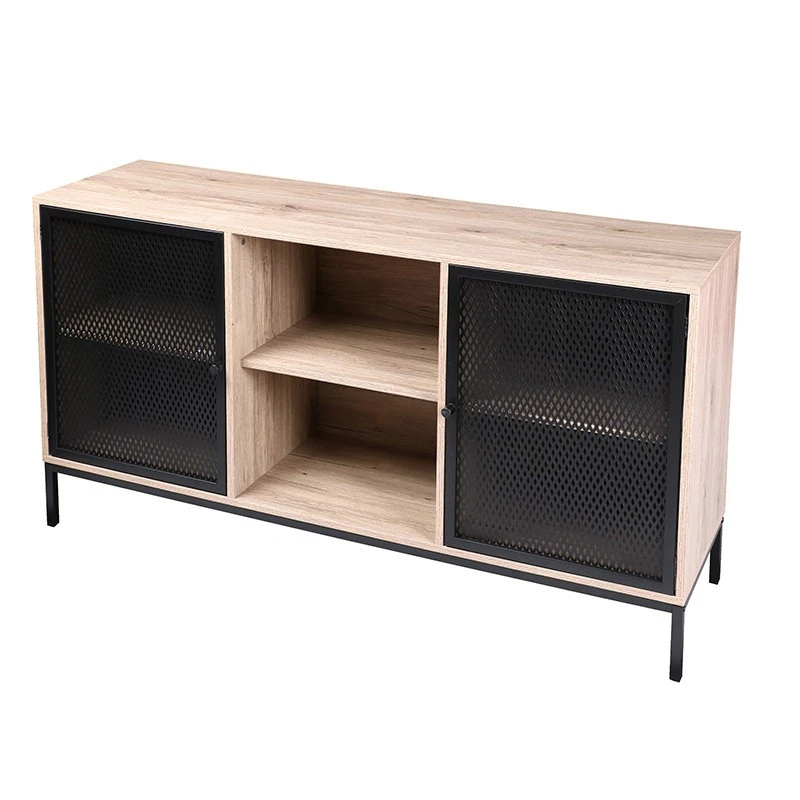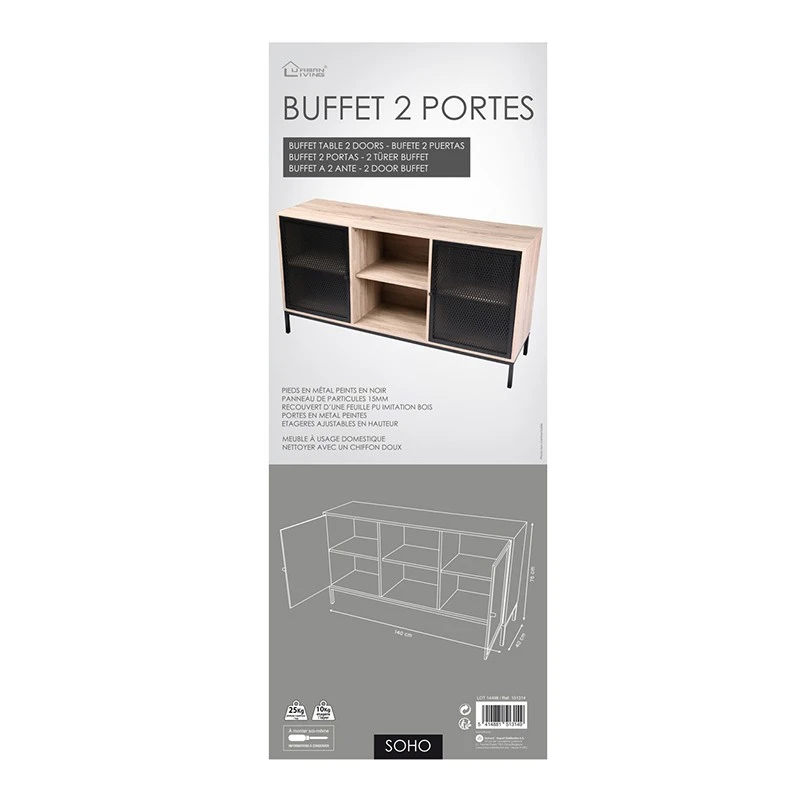 Buffet en métal et imitation bois de hauteur 75 cm. Ce buffet est composé de deux portes effet grillage avec étagère intérieure ainsi que de deux niches. Idéal pour ranger votre vaisselle par exemple.