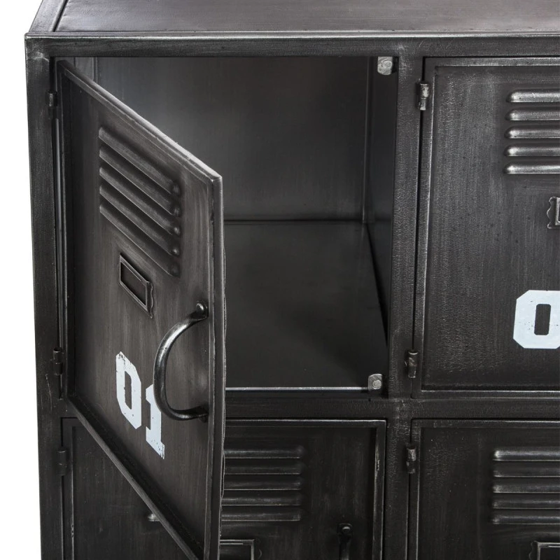 Meuble Sevin de marque Atmosphera. La tendance est aux meubles en métal qui décorent tout en offrant des espaces de rangement. Assorti au meuble 4 portes Sevin. Meuble sur roulettes, type casier, 6 portes numérotées. A monter soi-même.