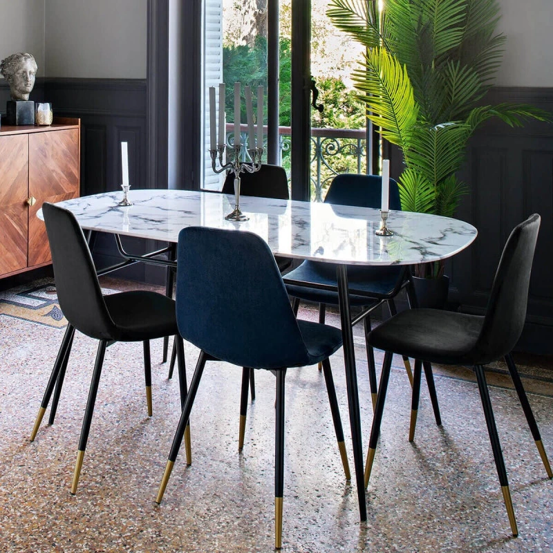 Chaise en velours bleu de la marque Atmosphera. Craquez pour le design du velours dans votre salle à manger. Le piétement doré apporte une touche élégante et moderne à cette chaise Tyka.