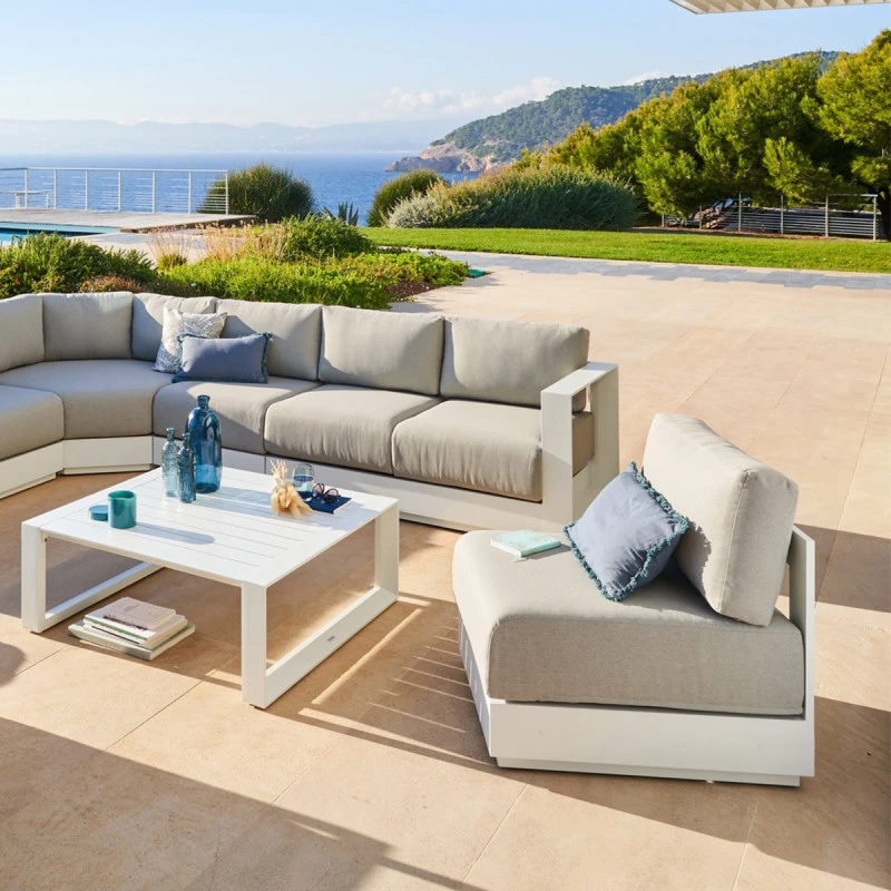 La structure est en aluminium traité époxy antirouille. Les coussins polyester 275 g/m² sont déhoussables pour un entretien facile et traités déperlants permettant à l’eau de glisser sans pénétrer dans la matière.