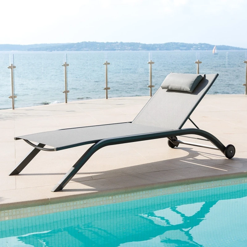 Profitez des beaux jours grâce à ce transat gris galet et structure graphite de la marque Hespéride.
